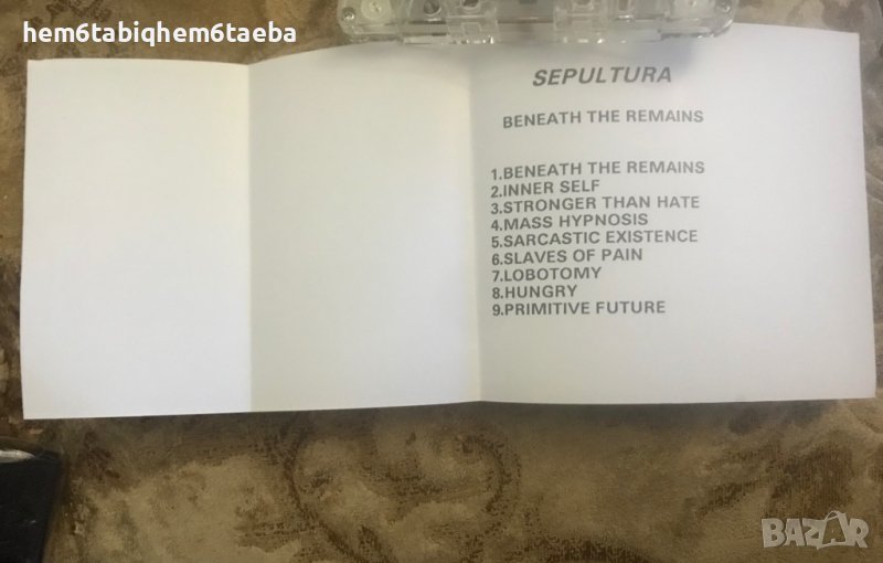Рядка касетка от личната ми колекция на SEPULTURA - Beneath the Remains от варненската фирма NIVERO , с разгъваща се обложка с текстовете. Това е касетката с най-добрата обложка на този албум от онова време на нашия пазар.