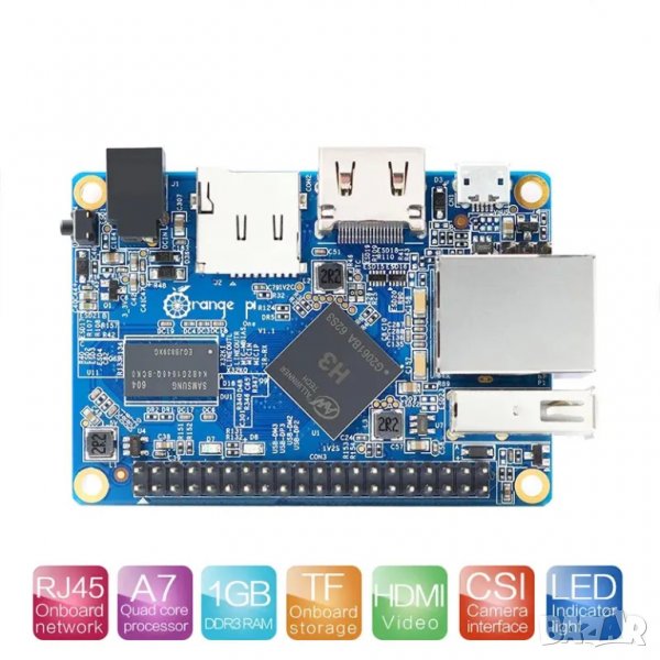 Orange Pi One H3 е компактен, но мощен едноплатков компютър, който използва Allwinner H3 SoC с четири ARM Cortex-A7 ядра, способен да обработва видео до 4K H.265/HEVC. Разполага с 1GB DDR3 RAM, което позволява плавна работа с леки десктоп среди, медийни приложения или сървърни задачи на домашно ниво. Поддържа разнообразни операционни системи като Ubuntu, Debian и други Linux дистрибуции, както и някои Android версии.