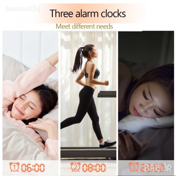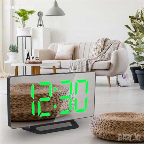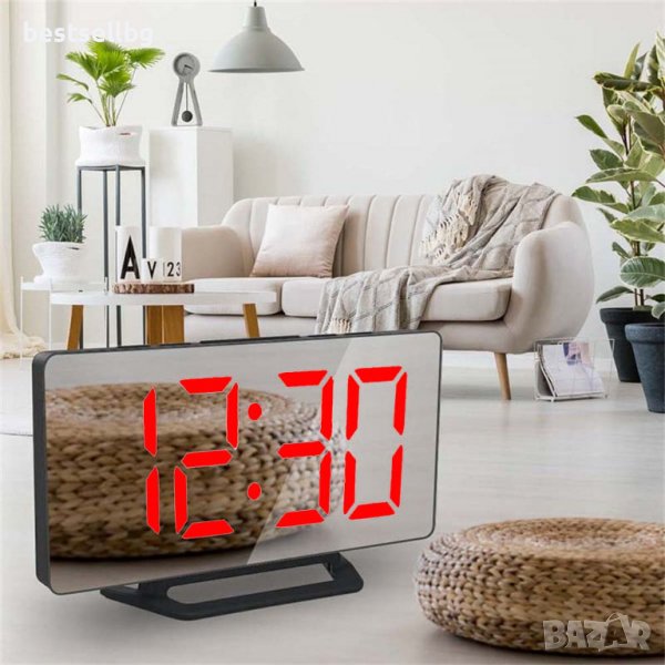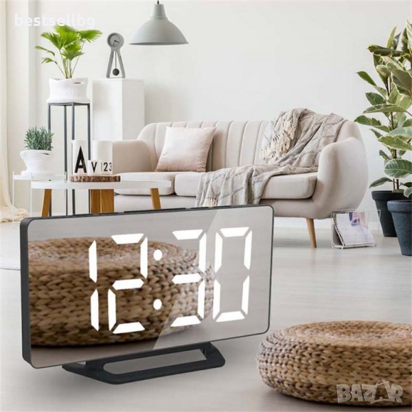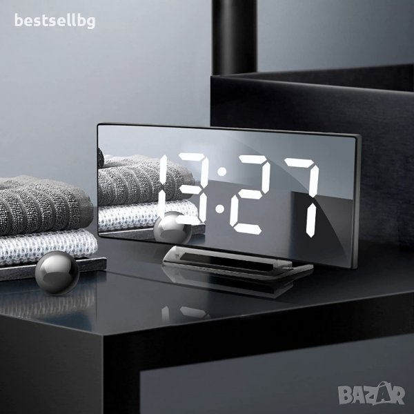 Интелигентен извит LCD часовник с нощен режим автоматично намаляване силата на светене от 18:00 - 7:00 Огледален ефект на дисплея, регулиране силата на цифрите 3 нива, измерване на температура, аларма захранване на ток