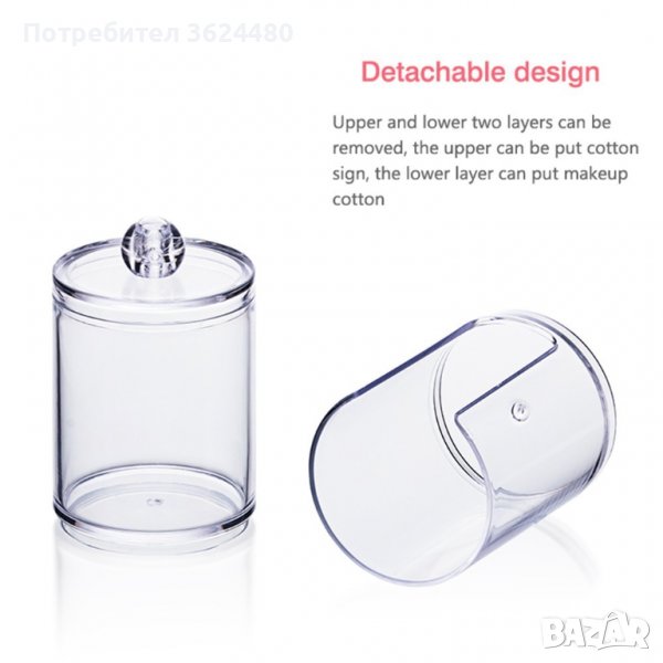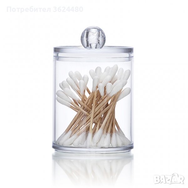 Удобна поставка-диспенсър с две отделения - за памучни тампони и клечки за уши, изработена от прозрачна пластмаса.