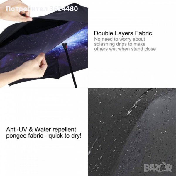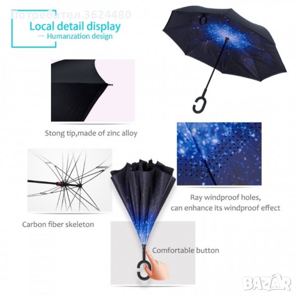 Дръжката е ергономична в стил свободни ръце, чадърът съхне много бързо. Приблизителните му размери са 100 в диаметър и 80 сантиметра по дължина. Конструкцията му дава възможност на човек да не се блъска в останалите минувачи, когато навън вали дъжд. Също така имате панорамен изглед отпред и встрани. Когато се приберете у дома на сухо, чадърът няма да намокри пода, защото водата е в образуваната вдлъбнатина. Вместо дъждовните капки да отидат към ръбовете, те се събират като в резервоар.