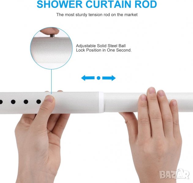- 🛁【Стъпки за инсталиране】: ①Регулирайте дължината на телескопичния прът, така че да е с 5-8 см по-дълъг от необходимото. ② Натиснете тънкия край на телескопичния прът към тавана и плъзнете другия край нагоре. ③Завършете инсталацията.