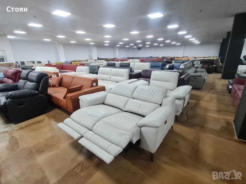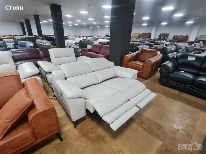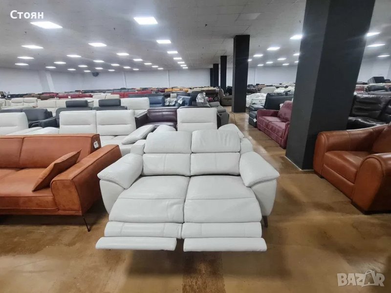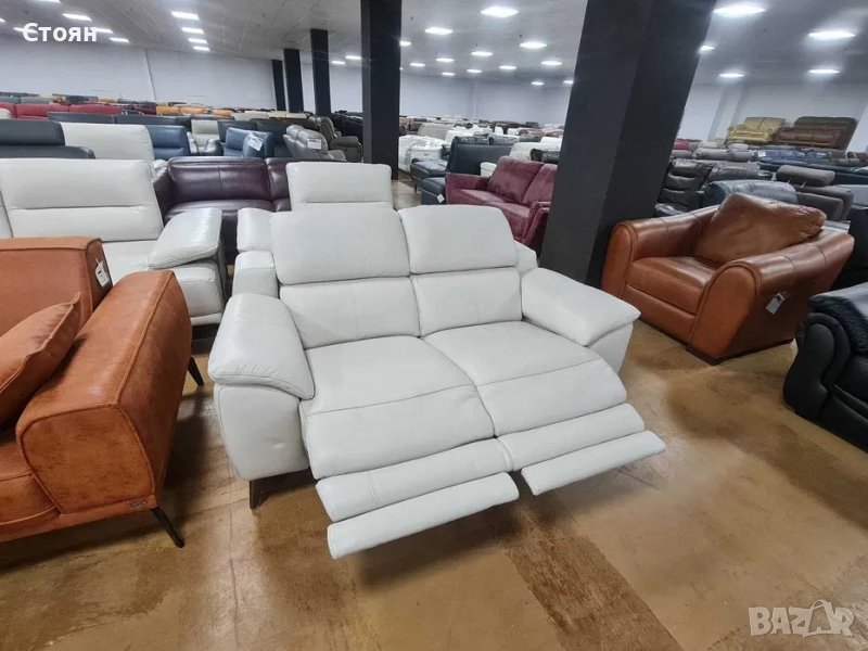 Светло сив кремав кожен диван двойка с ел релаксиращ механизъм → Обява 39964126