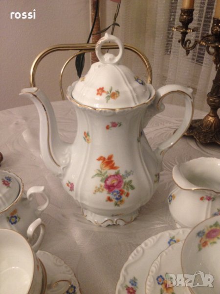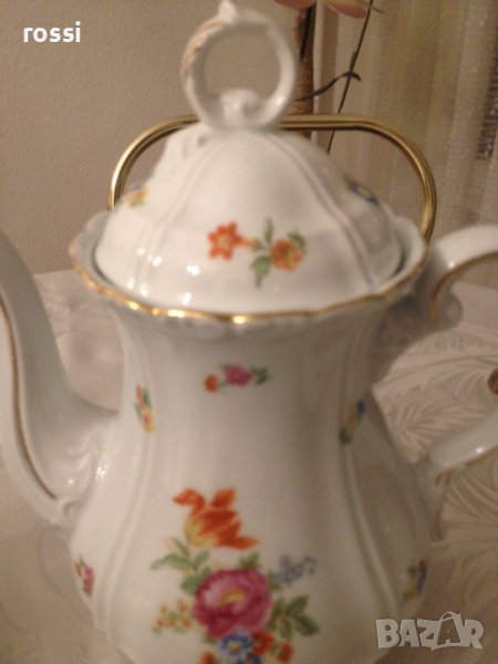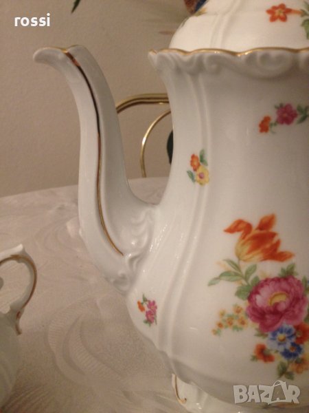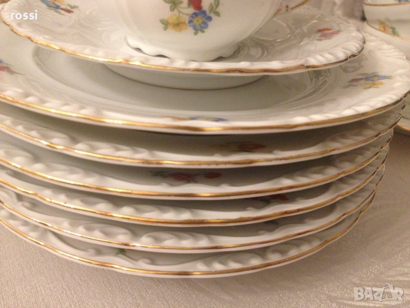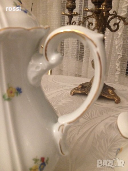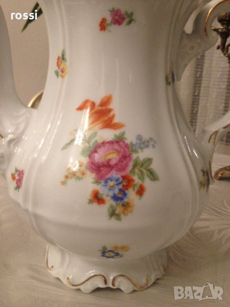 - бял, фин, лек, искрящ порцелан, с фин релеф по края, декориран с красиви майсенски цветя и позлата с изключителна трайност,