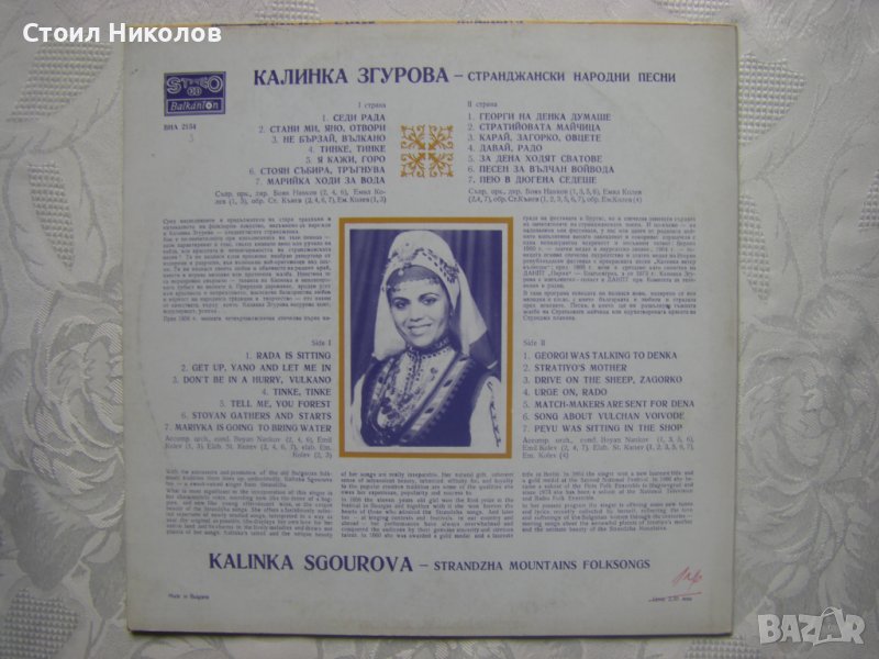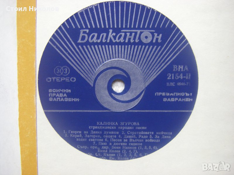 Грамофонна плоча - ВНА 2154 - Странджански народни песни изпълнява Калинка Згурова