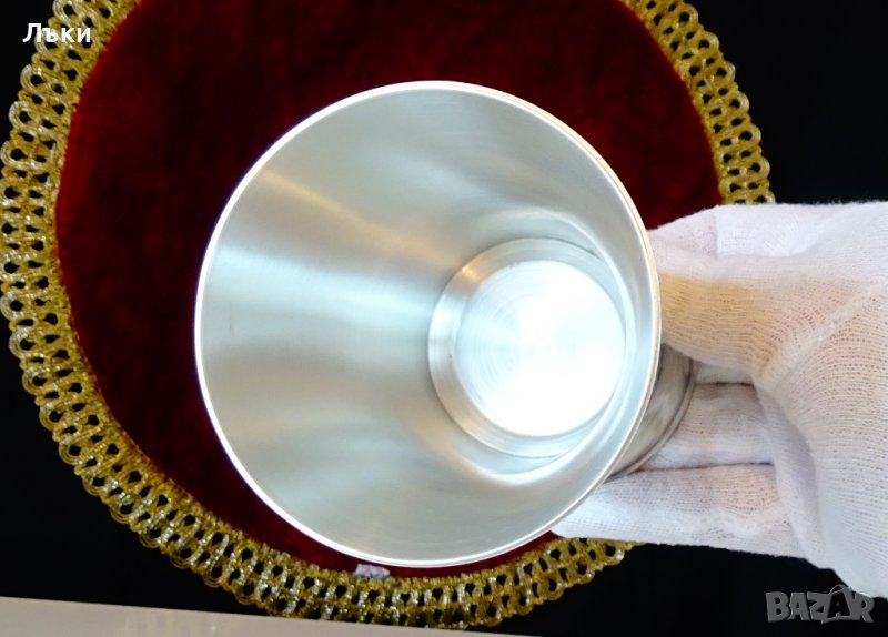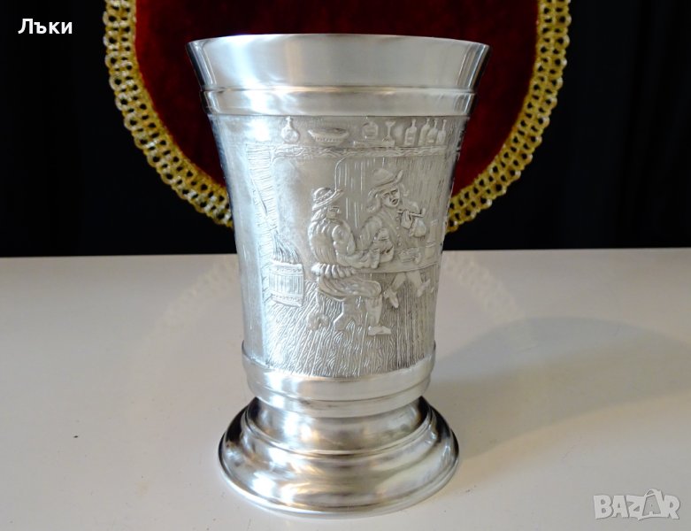 калай и 5% сребро,маркирана.Декорирана с релефна картина на трапеза с гости пред камината.Перфектно качество,блести като направена от сребро.Височина 11.5 см.,диаметър 8 см.,тегло 240 гр.Вместимост 250 мл.