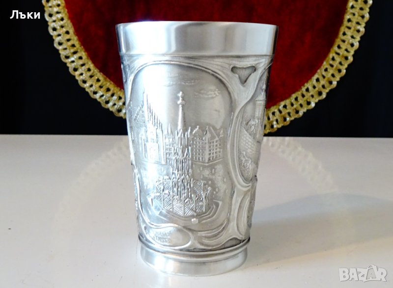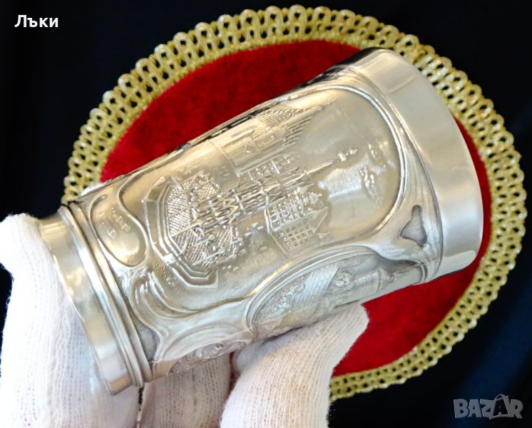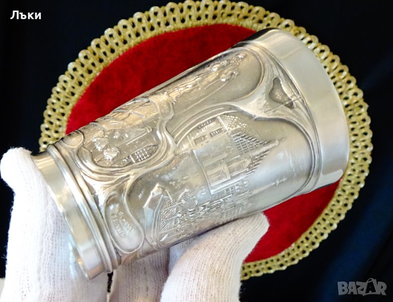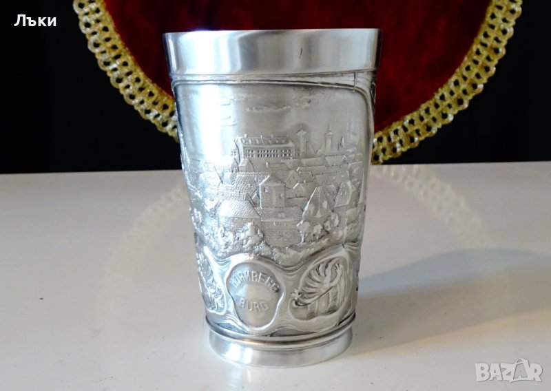 95% калай и 5% сребро. Декорирана с релефни изображения на статуята на Човекът Гъска,архитектурни забележителности,герба на Нюрнберг и орнаменти в стил сецесион.Високо качество,масивност и блясък.Височина 9 см.,диаметър 6 см.,тегло 115 гр.Вместимост 150 мл.