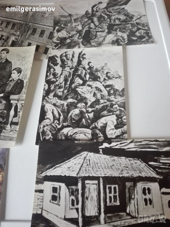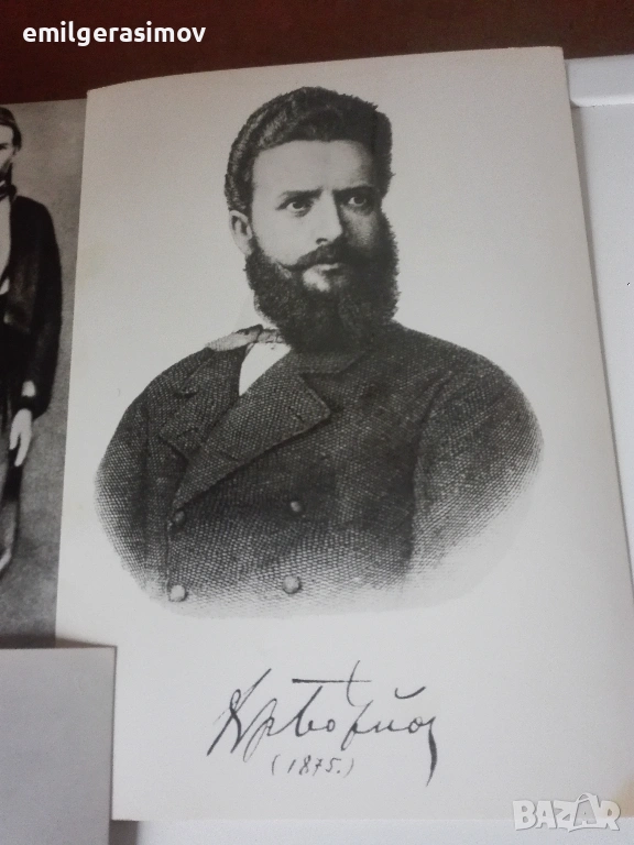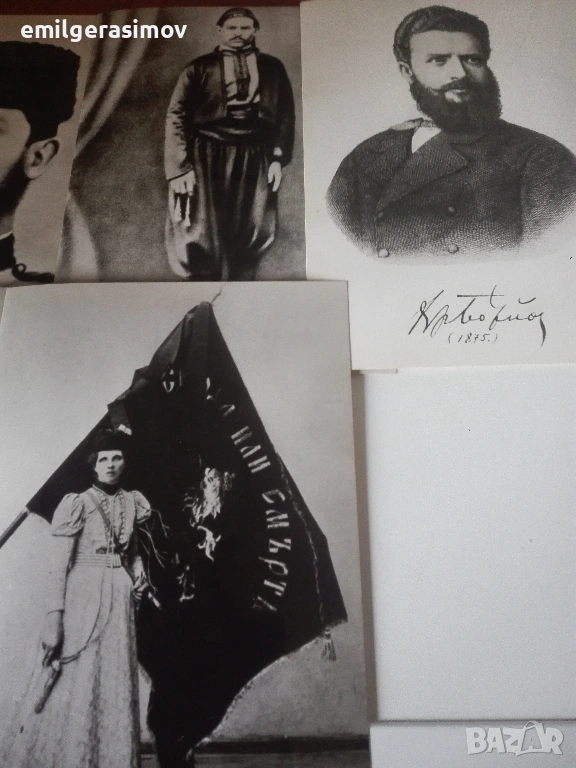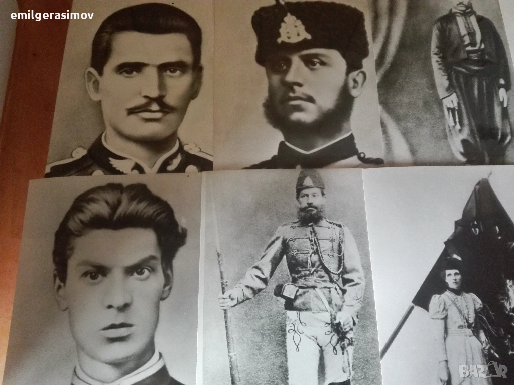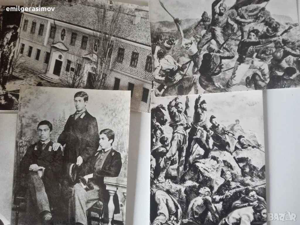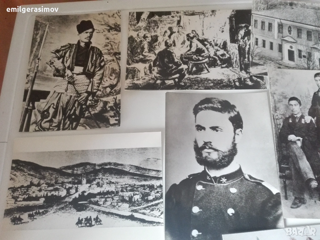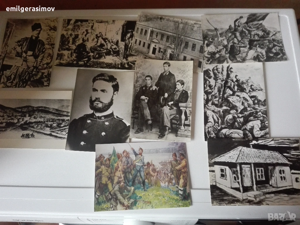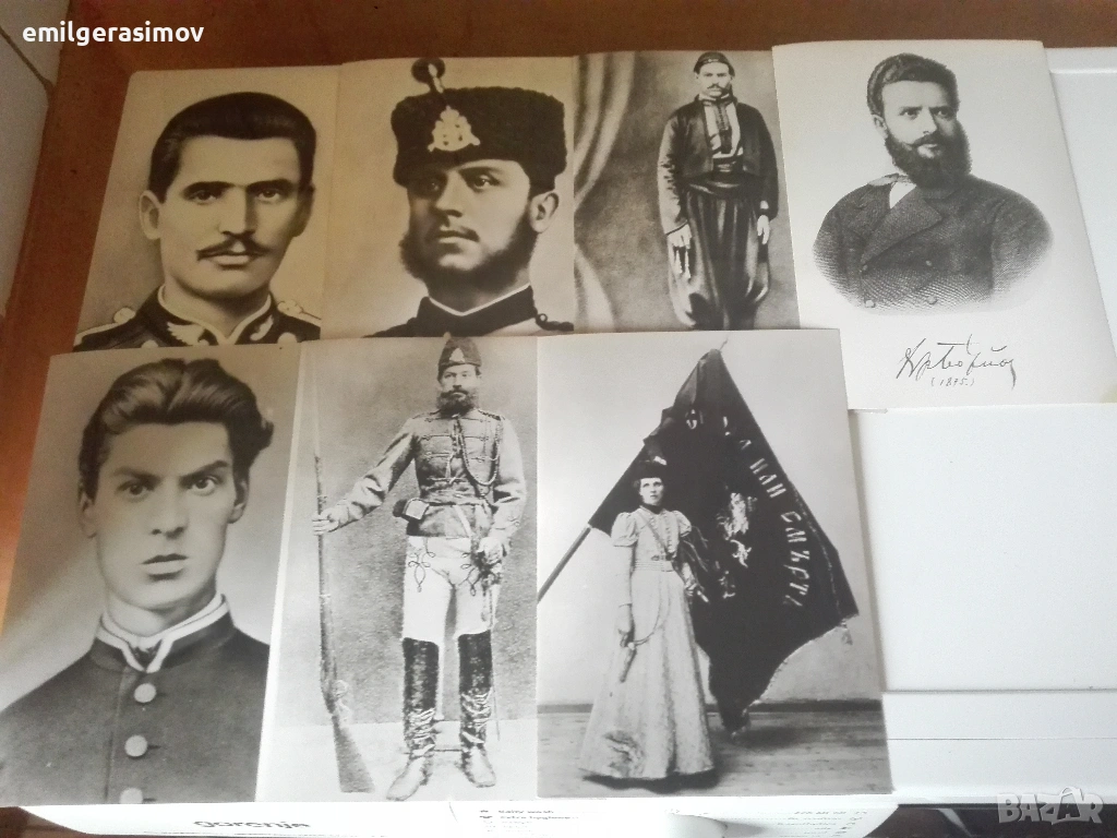 2. Хр. Ботев , Райна Княгиня , Георги Икономов , Поп Харитон , Панайот Волов , Ангел Кънчев , Сава Геренов , Никола Симов -Куруто , Кочо Честименски , Иларион Драгостинов.Седем големи картички с революционери участници в Априлското въстание 21/15 см и 10 броя за Ботевата чета.с размер 15/9.5 см.Отлично състояние. Няма прегъвани или зацапани. Цена 10 евро.