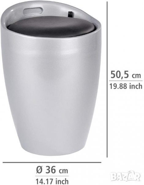 пране с подплатен капак от WENKO, табуретка: ABS пластмаса; Чанта за пране: 100% полиестер, без BPA, капацитет 20 L, Ø 36 x 50,5 cm, сребриста