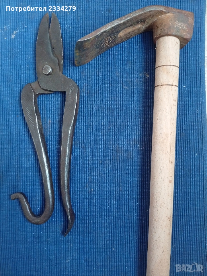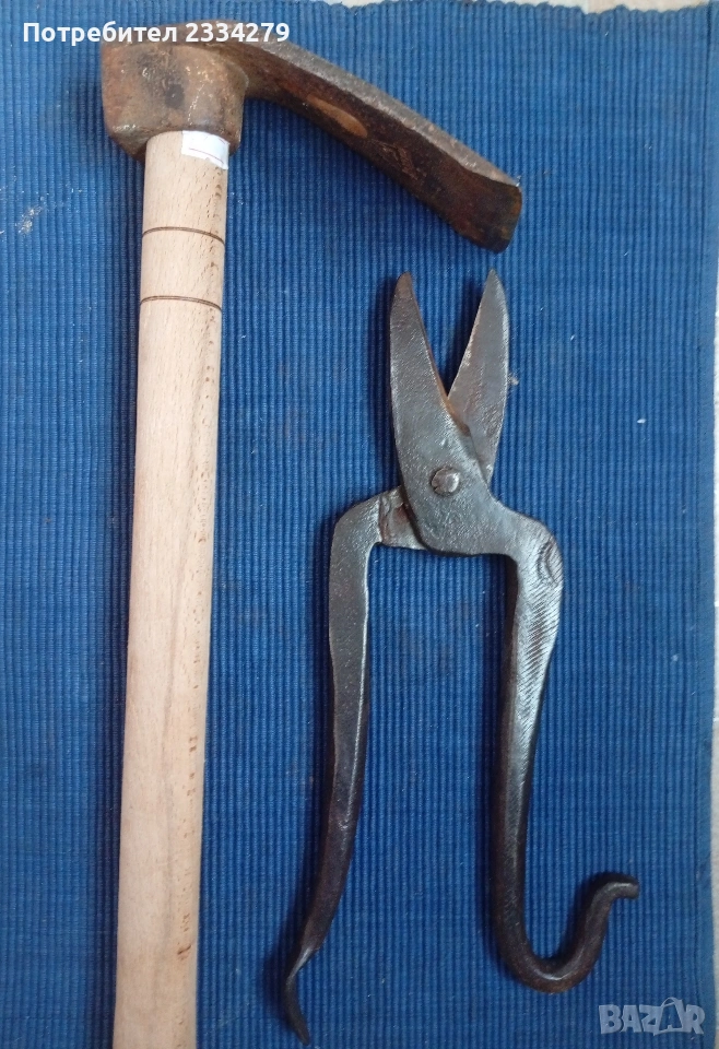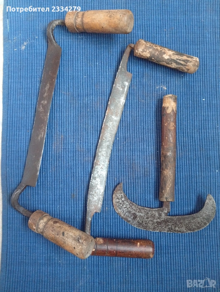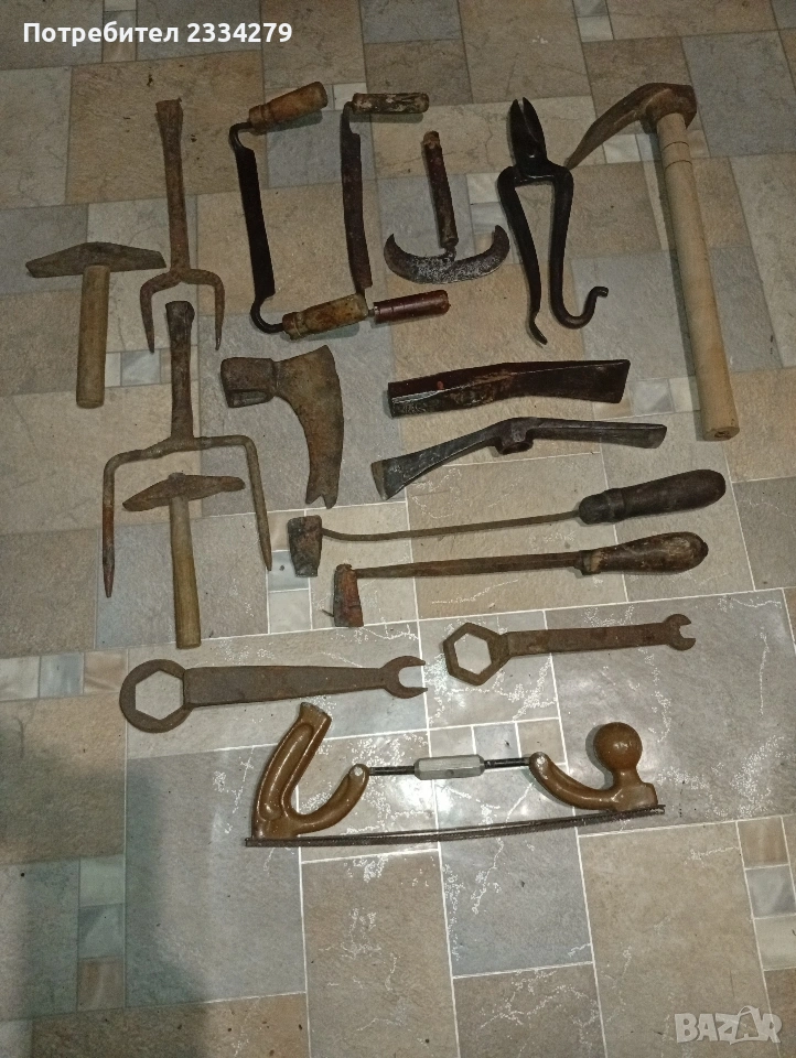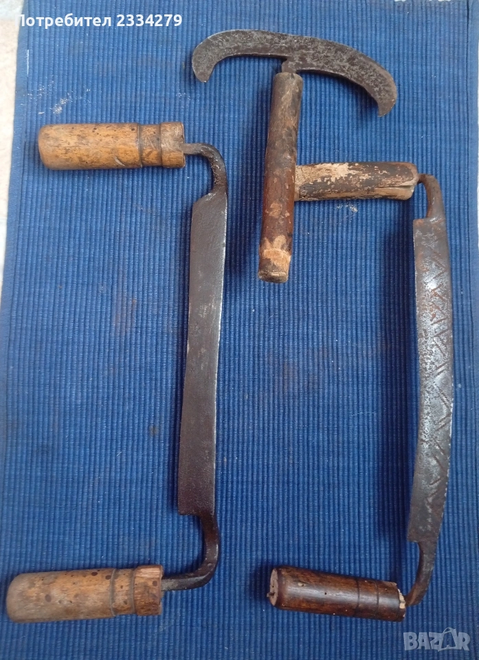 колела от каруца, ръчно ковани преди 100години, налични три броя, цена 13€. за брой, всички 100% автентичност; N:2 коларски ключове за каруци файтони ръчно ковани, 3броя различни размери с цена 3€. за брой; N:3 коларски дърводелски свредели за дупки, ръчно изковани, цена 3€. за брой.; N:4 два броя ръчно изковани тъкани, инструменти за белене на кори, единият от възрождението с наковани орнаменти,размери 28х2см., цена 15€., другият е с размери 27х2см., цена 10€.; N:5 автентичен сарашки нож, ръчно изкован през турски времена,размери на острието 14х4см., цена 10€.; N:6 стар ръчно изкован инструмент с наковани орнаменти от възрождението, масивен размери 29х5см., цена 15€.; N:7 каменарски, зидарски чук от миналият век има накован щемпъл немски верояно от работилниците на солинген, размери 24х6х3см., цена 8€.; N:8 стара ръчно изкована брадва-кривица, цена 5€.; N:9 българско тенекеджийски ренде от 80-те години в Габрово има семпъл,много добре запазена пила с две страни, цена 11€.; N:10 стари нагряващи поялници от началото на 20-ти век, медна човка,ръчно изработени, цена 4€. за брой; N:12 стара ръчно изкована ножица от началото на миналият век, използвана за ламарина,кожа и други, масивна режеща,запазена, цена 15€.