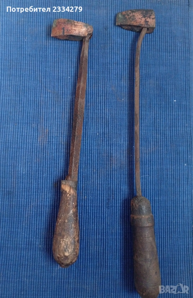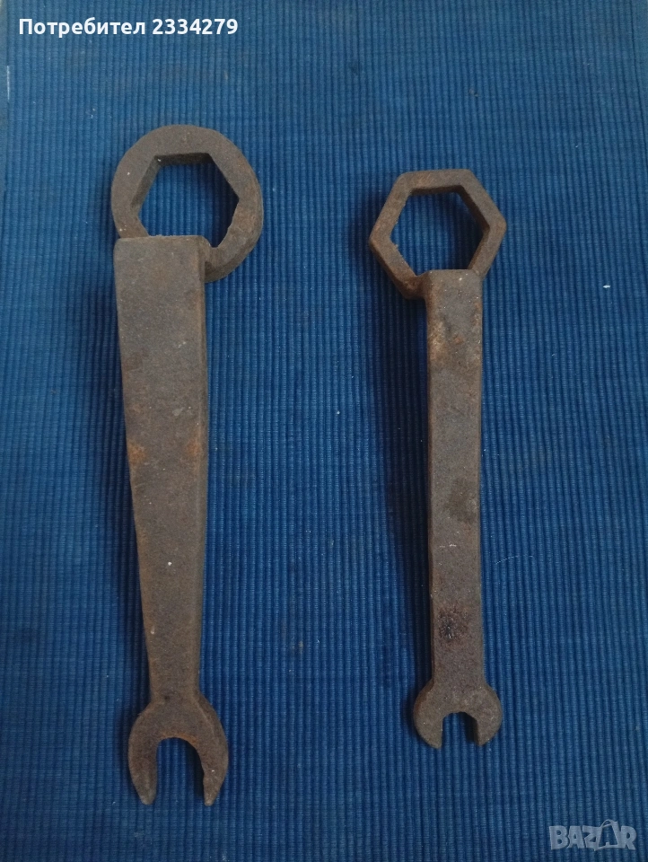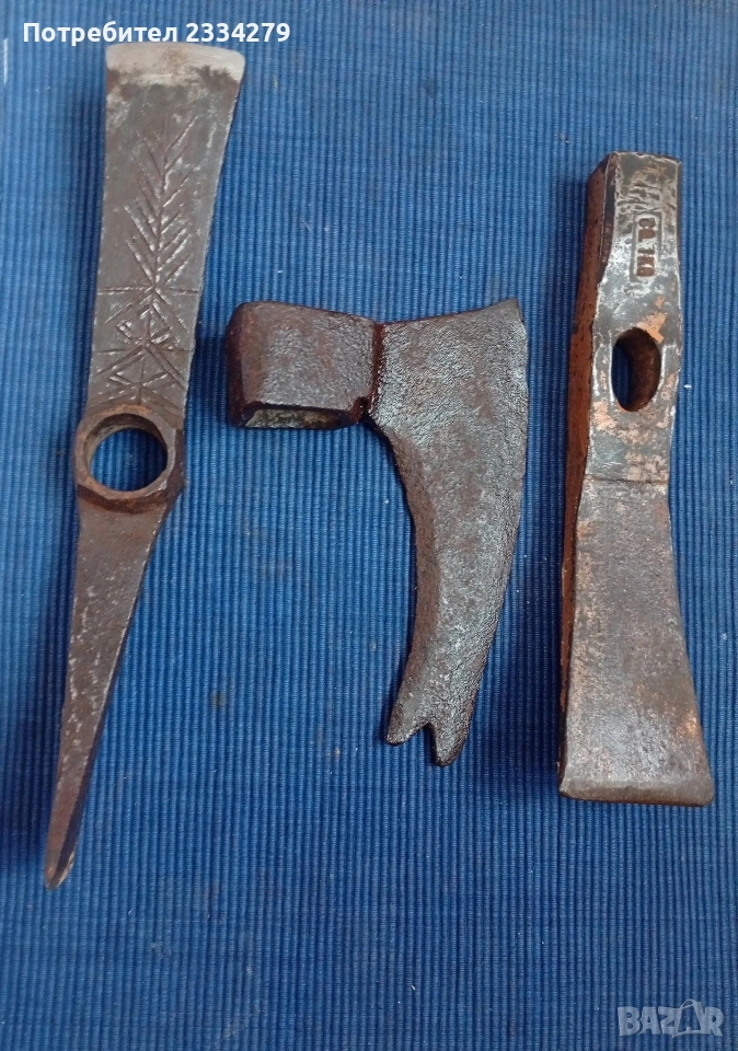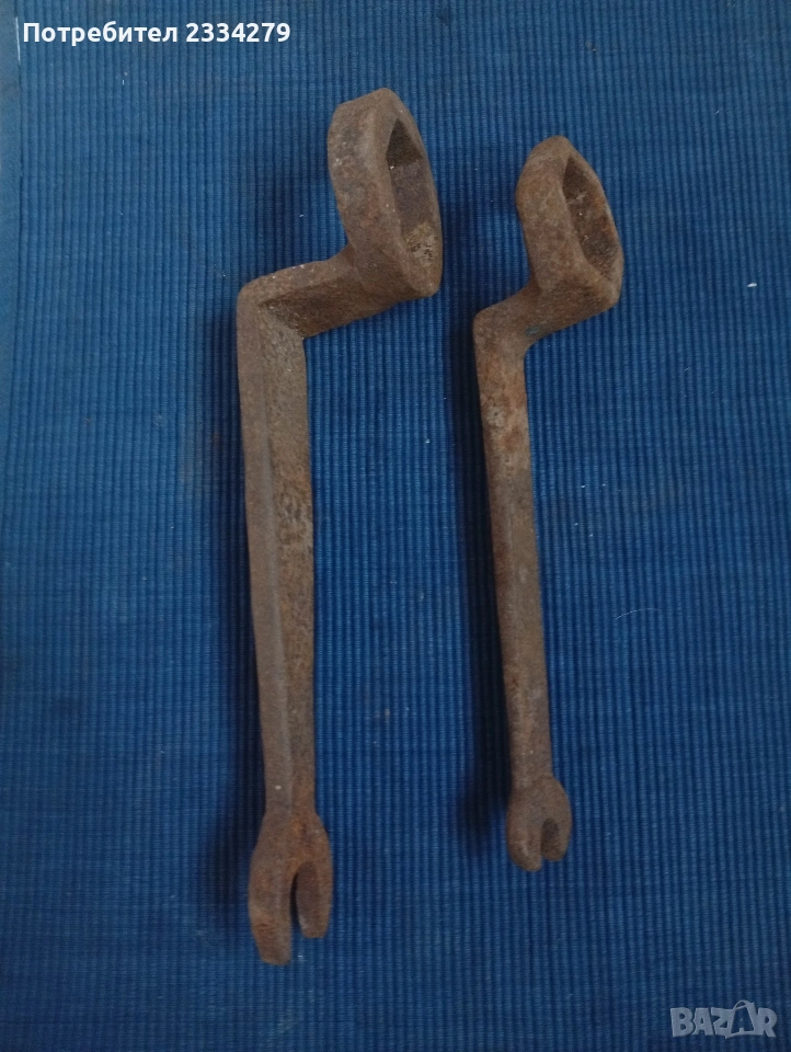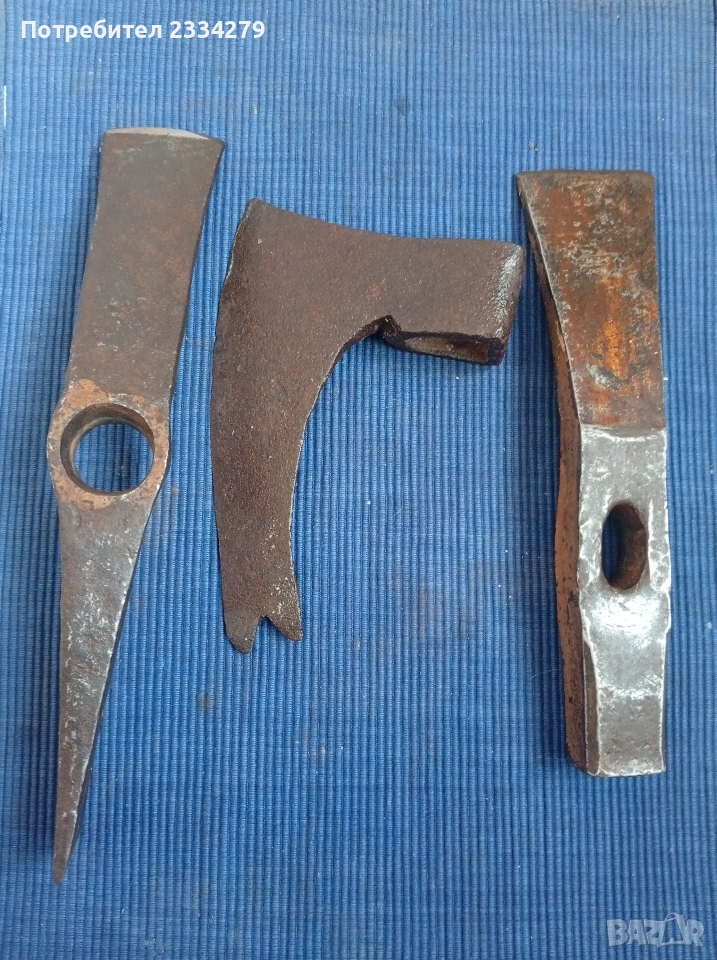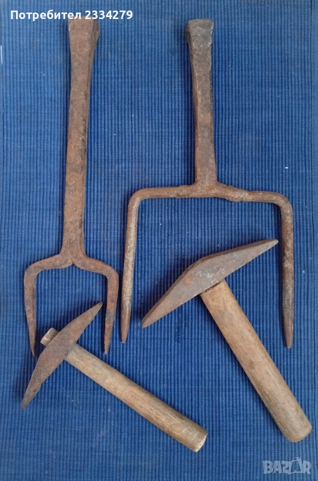 колела от каруца, ръчно ковани преди 100години, налични три броя, цена 13€. за брой, всички 100% автентичност; N:2 коларски ключове за каруци файтони ръчно ковани, 3броя различни размери с цена 3€. за брой; N:3 коларски дърводелски свредели за дупки, ръчно изковани, цена 3€. за брой.; N:4 два броя ръчно изковани тъкани, инструменти за белене на кори, единият от възрождението с наковани орнаменти,размери 28х2см., цена 15€., другият е с размери 27х2см., цена 10€.; N:5 автентичен сарашки нож, ръчно изкован през турски времена,размери на острието 14х4см., цена 10€.; N:6 стар ръчно изкован инструмент с наковани орнаменти от възрождението, масивен размери 29х5см., цена 15€.; N:7 каменарски, зидарски чук от миналият век има накован щемпъл немски верояно от работилниците на солинген, размери 24х6х3см., цена 8€.; N:8 стара ръчно изкована брадва-кривица, цена 5€.; N:9 българско тенекеджийски ренде от 80-те години в Габрово има семпъл,много добре запазена пила с две страни, цена 11€.; N:10 стари нагряващи поялници от началото на 20-ти век, медна човка,ръчно изработени, цена 4€. за брой; N:12 стара ръчно изкована ножица от началото на миналият век, използвана за ламарина,кожа и други, масивна режеща,запазена, цена 15€.