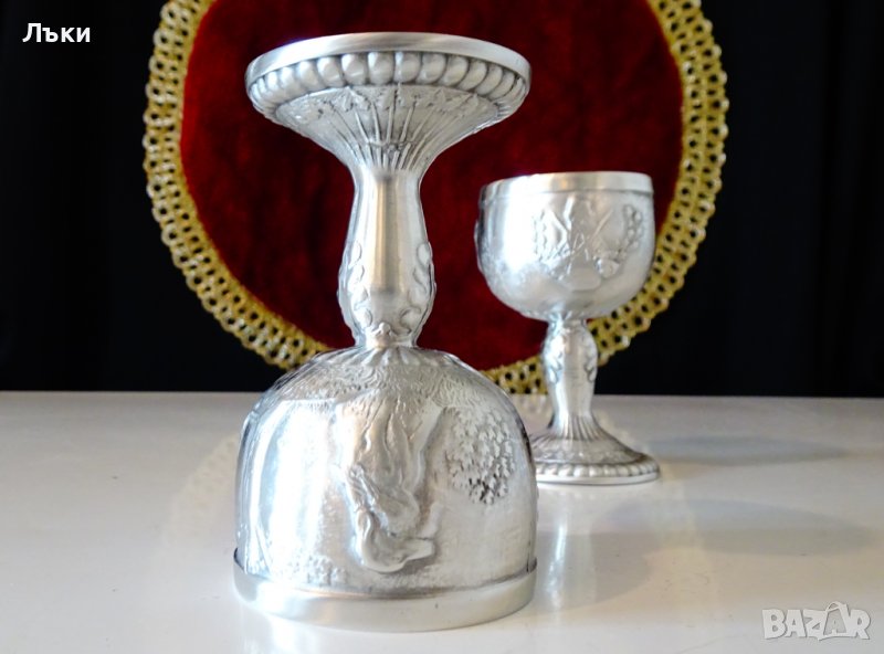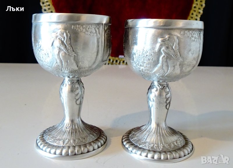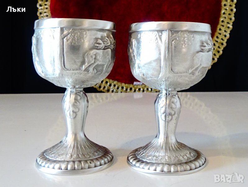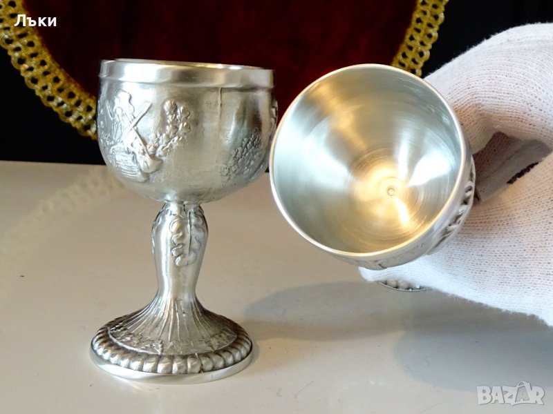 Старинни немски чаши за ракия,коняк,водка,на елегантно столче,майсторска ръчна изработка от 95% калай и 5% сребро.Декорирани с релефни ловни картини –куче с дивеч,елен в любовен период и герб на ловците.Красотата на картините се допълва от релефни дъбови листенца и орнаменти.Височина 7.5 см.,диаметър 4.5 см.,тегло на всяка 90 гр.Вместимост 50 мл.