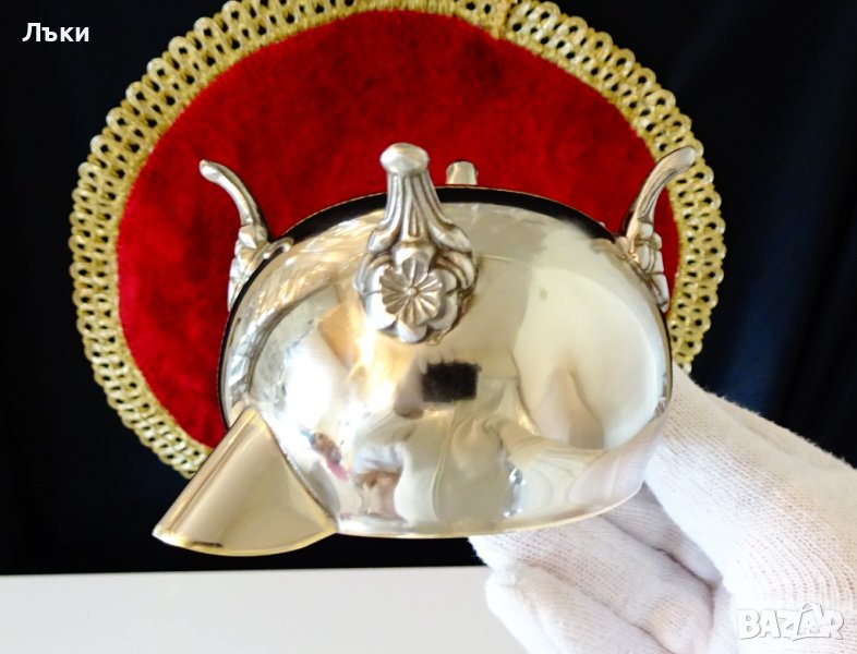 от високо качествен бронз.От вън е дебело посребрена с висока проба