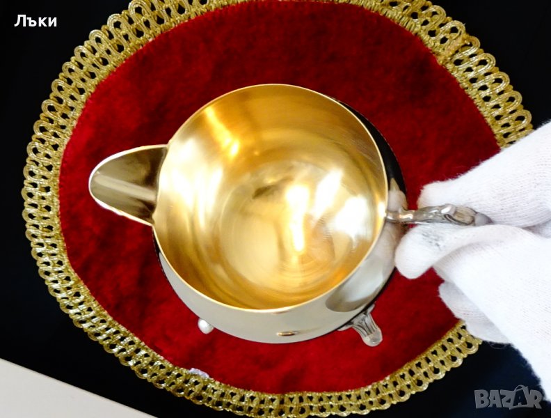 сребро,родирана за блясък и трайност.Вътре е позлатена.Стои стабилно на четири