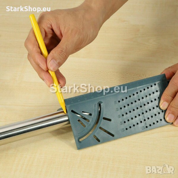 Ъгъл с транспортир и дюлгерски молив за измерване на ъгли за триизмерни детайли – за работа с триизмерни елементи като греди, тръби и др.