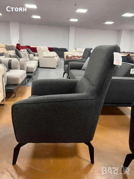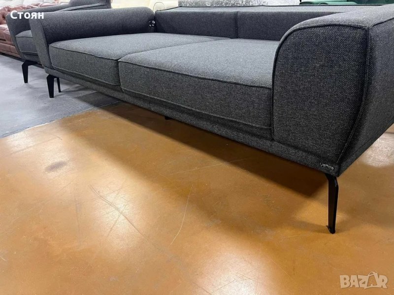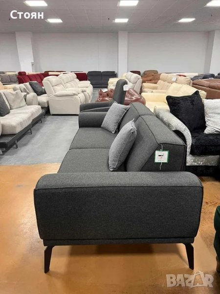 Тъмно сив комплект от плат тройка с два фотьойла с функция сън. Облегалката на дивана пада назад.
