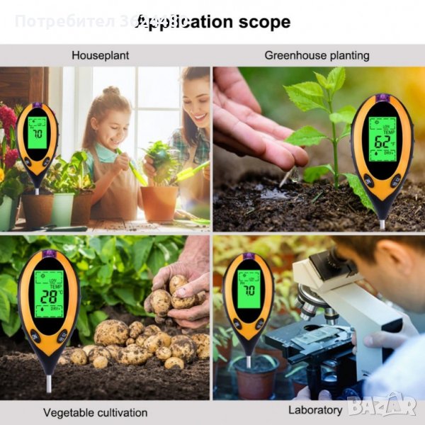 Мултифункционален измервателен уред, показващ четири показатели на почвата – влажност, pH, температура и осветеност.