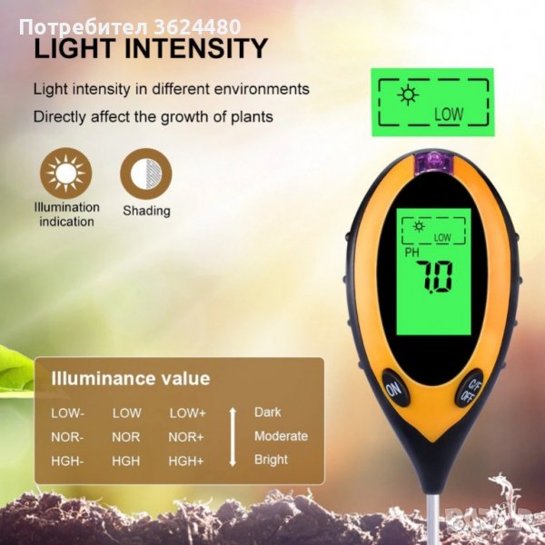ИЗМЕРВАТЕЛ НА РН, ВЛАГА, ТЕМПЕРАТУРА И ОСВЕТЕНОСТ НА ПОЧВАТА