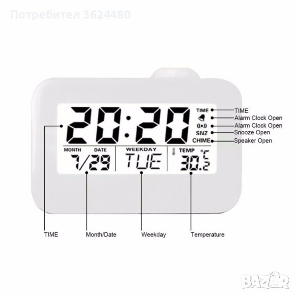 LCD дисплей със синя подсветка показва час, температура, дата, месец и ден от седмицата; Активиране на проекцията и лед подстветката чрез пляскане с ръцете или почукване по корпуса. Часовникът е с аларма и отлагане на алармата.