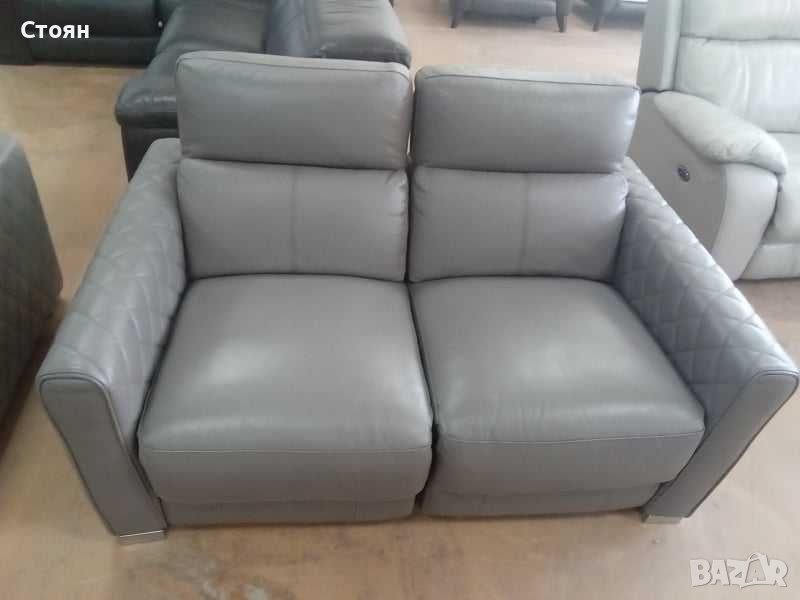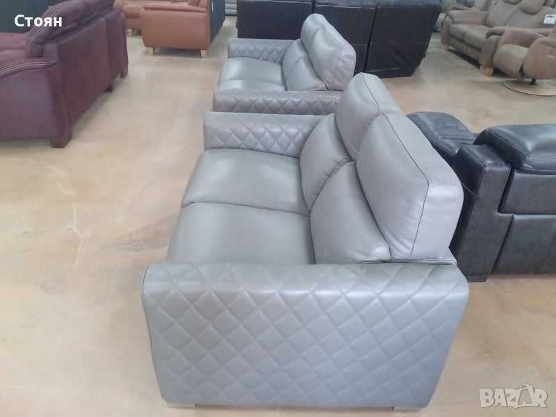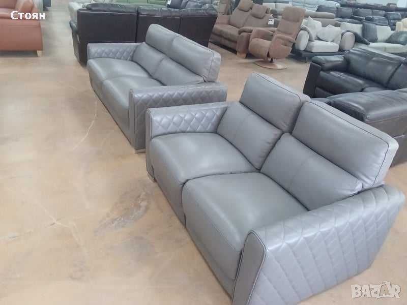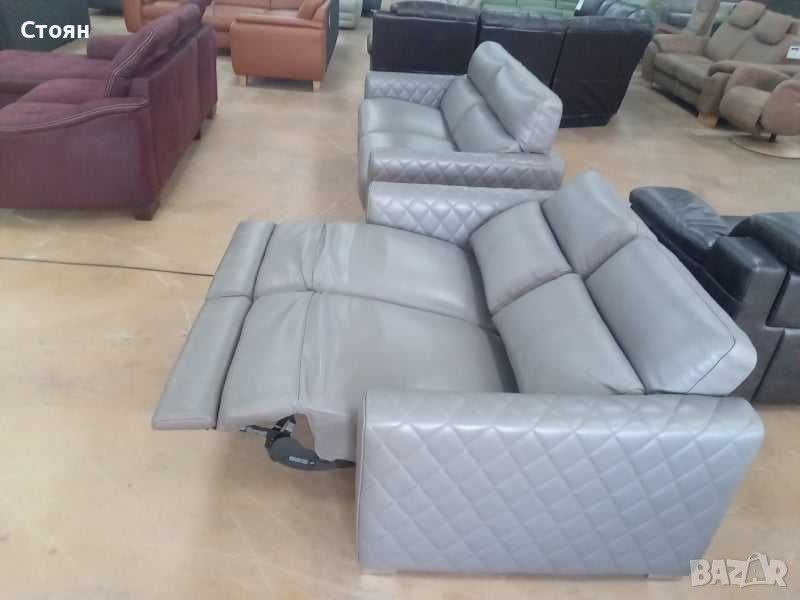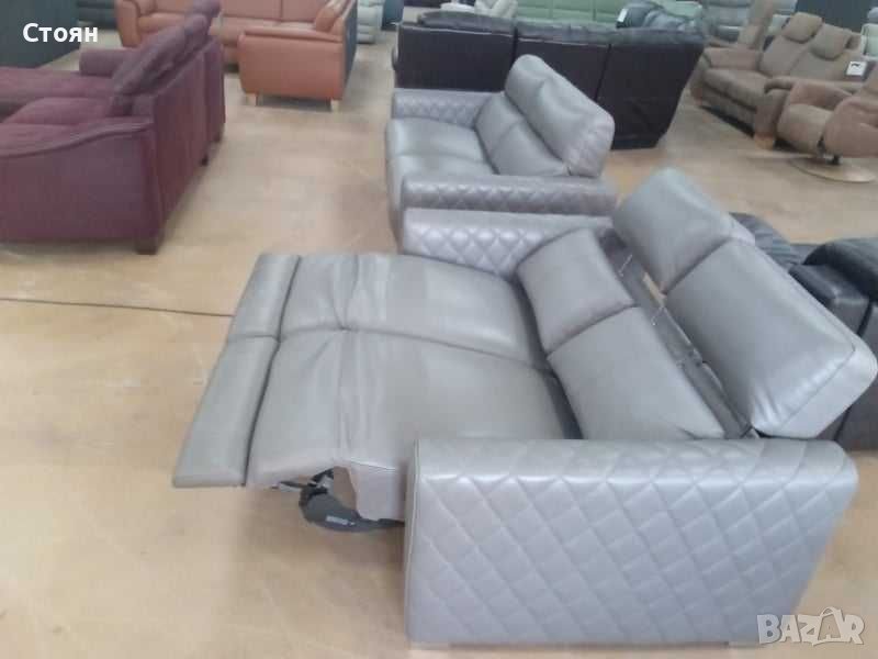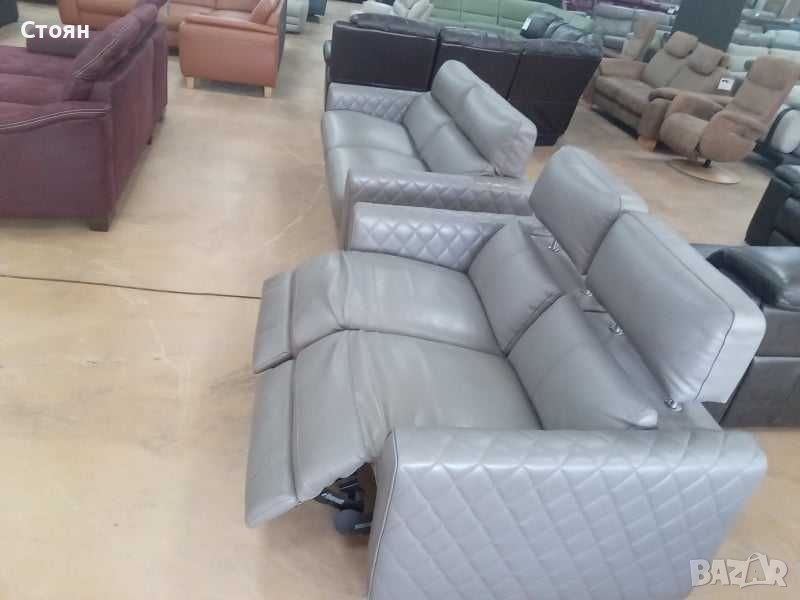 Сиви кожени дивани тройка и двойка с релаксиращ механизъм.