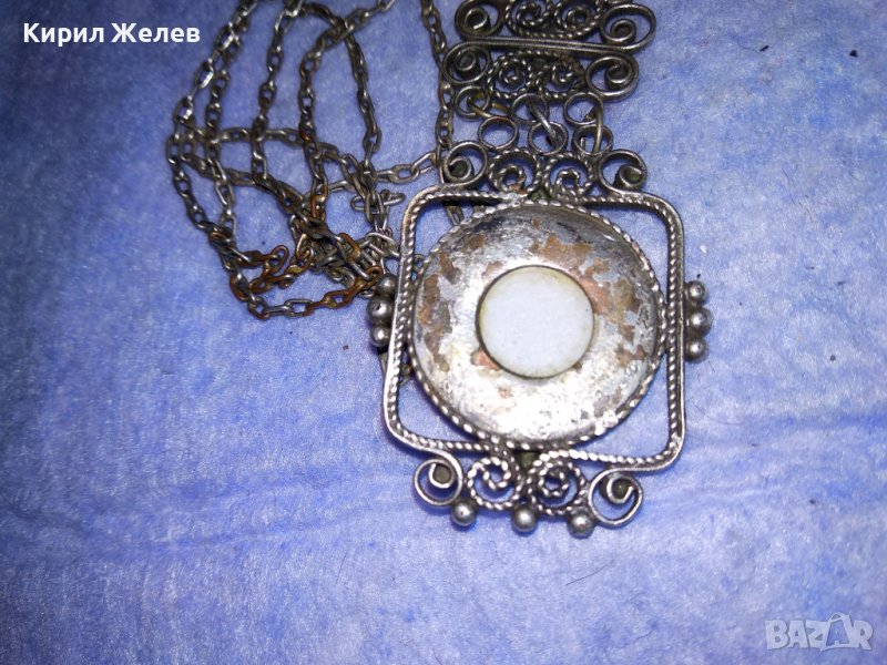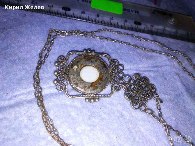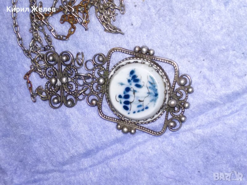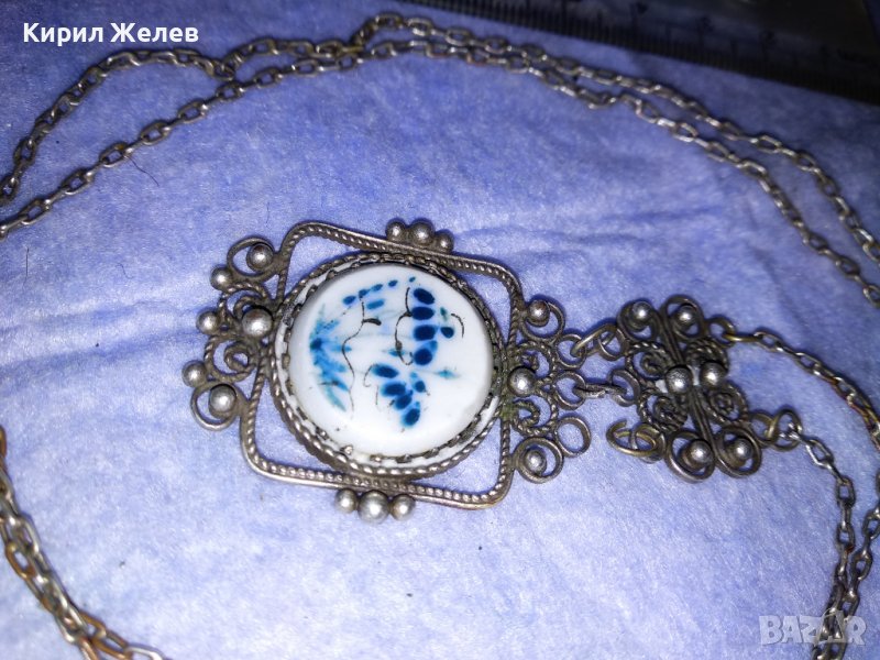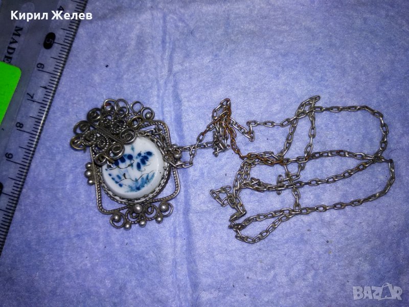 СТАРИНЕН ПОСРЕБРЕН МЕДЕН МАЙСТОРСКИ МЕДАЛЬОН с РЪЧНО РИСУВАН ПОРЦЕЛАН и ПОСРЕБРЕНО СИНДЖИРЧЕ 32865