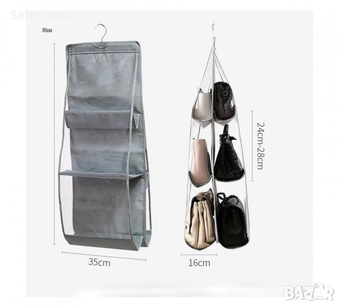 Сив калъф за съхранение със закачалка и 6 прозрачни гнезда за организиране и защита на вашите чанти. Всеки слот е с размери 22x12x29 см и е идеален за пликове, клъчове, чанти и чанти за кръст. Закачете го на релсата на гардероба и ще имате незабавен достъп до любимите си аксесоари.