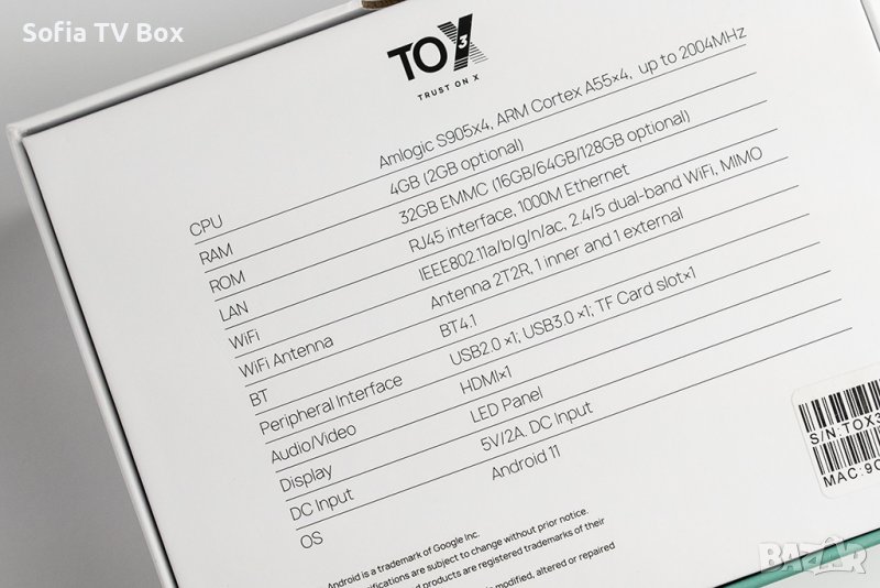 Едно от най-популярните и предпочитани устройства с Amlogic S905X4 SoC. Фърмуерът на TOX3, който е разработен от Ugoos, получава редовно ъпдейти и предоставя възможност устройството да бъде ползвано както със стандартния Android (AOSP), така и с Android TV (ATV). Наличен е вграден Samba server, контрол на root достъпа, init.d скриптове, navigation bar и status bar с информация за мрежовия трафик, използвани системни ресурси (CPU/RAM), температура, честота и много друга полезна информация. Вграден Auto frame rate (AFR) с възможност за контрол на приложенията, за които да бъде активиран. Устройството разполага с 4GB RAM памет, 32GB вътрешна памет, гигабитов Ethernet порт, качествен Wi-Fi 802.11a/b/g/n/ac 2x2 MIMO, USB 2.0 + 3.0, външна регулируема антена.