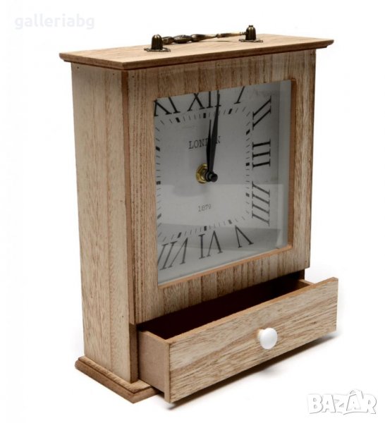 Декоративен дървен часовник във формата на скрин с метална дръжка и малко чекмедже отдолу. Часовникът е с римски цифри и работи с батерии.