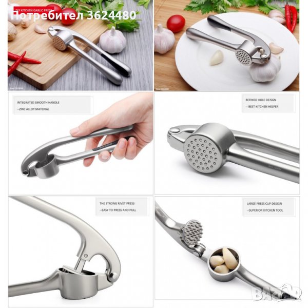 Метална преса за чесън, изработена от неръждаема стомана.