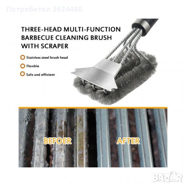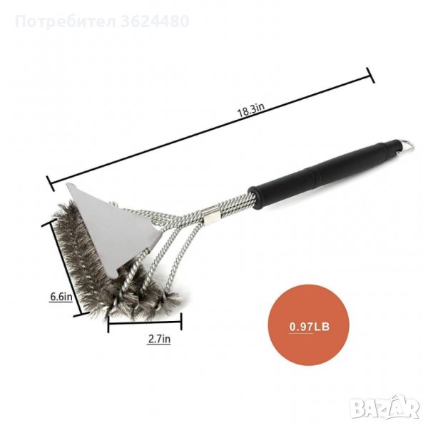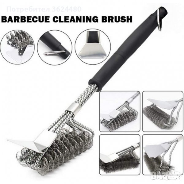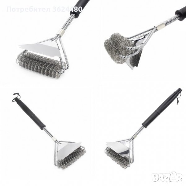 Дизайнът позволява лесно и бързо, за няколко минути, да почистите Вашето барбекю. Четката е дълга 45 см и се състои от две или три по-малки, разположени една до друга четки. Изработена е от неръждаема стомана. Снабдена с удобна дръжка, изработена от много издръжлива пластмаса. С удобна кукичка за закачане на четката.