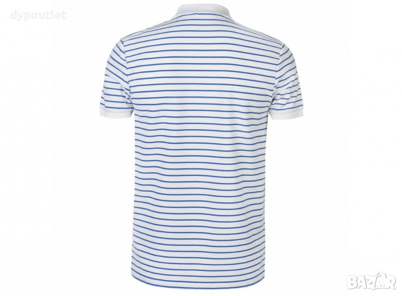 Тениска с яка, закопчаване с три копчета, с пришито лого, с оребрени маншети на ръкавите, в райе, цвят кралско синьо.
