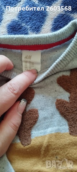 Пуловера е носен,само за снимки,в много добро състояние! За ръст 92 см.,леко уголемен на марката HM.