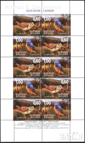 Чисти марки (2 х 5) в малък лист Екология Фауна Птици съвместно издание със Сърбия 2009 от България.