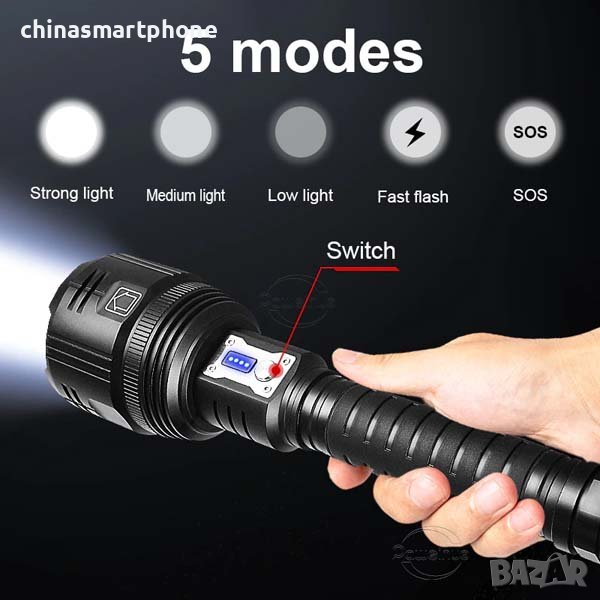 • 5 режима: висок-среден-нисък яркост-строб ефект и SOS