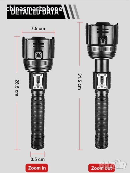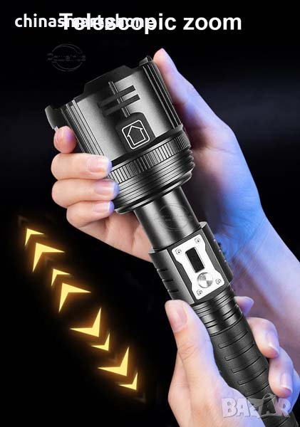 Над бутона за включване е разположен дисплей показващ нивото на батерията. Този фенер е един от най-добрите на пазара подходящ за лов, патрулиране, риболов, работа, къмпинг.