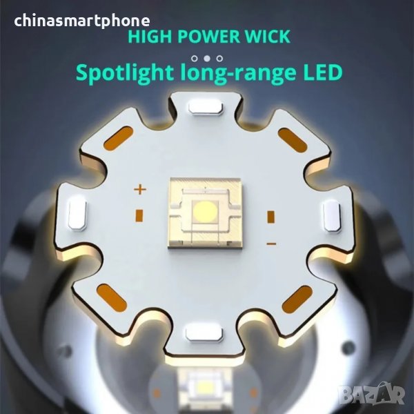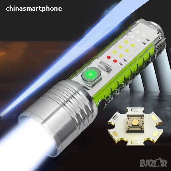 Мощен акумулаторно LED фенерче диод XML-T6, COB светлина (допълнителна светлина) с регулиране на фокусното разстояние и възможност за регулиране на точката на светене, акумулаторна батерия 18650, включени в цената.