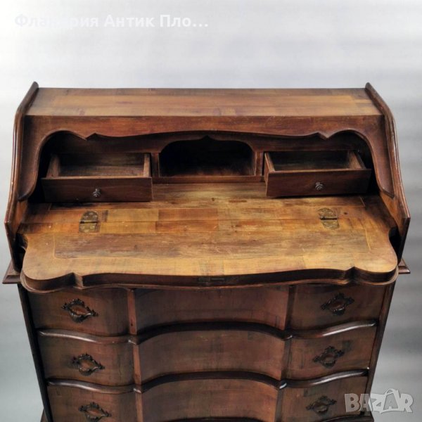 В горната част се разполага падащ писалищен плот, зад който са скрити малки чекмеджета.