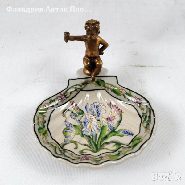 Мидата е изработена от състарен порцелан в червено, украсен с флорални мотиви, а за фигурката е използван плътен бронз с тъмна патина.