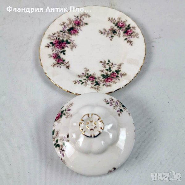 Royal Albert Lavender Rose е деликатен дизайн на роза, включващ малки розови рози с лавандула и зелени листа, разположени срещу нежно набраздена бяла рамка с позлатен кант.