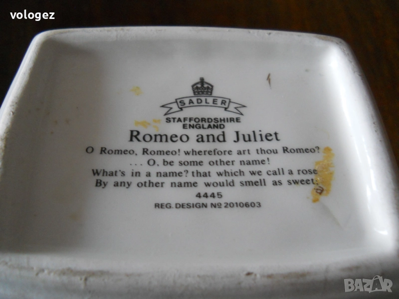 Колекционерски чайник Sadler с декорация на тема "Ромео и Жулиета". Височина 170 мм. Произведен е от James Sadler and Sons Ltd., основана в Стоук он Трент, Стафордшир, Англия през 1882 г. Компанията е известна със своите декоративни и колекционерски чайници. Бизнесът и името Sadler са придобити от Churchill China, която продължава да произвежда колекционерски артикули до около 2021 г.