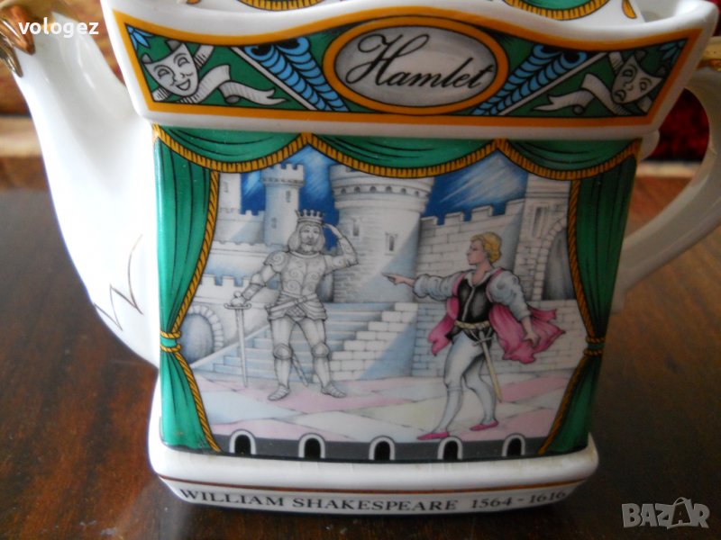 Колекционерски чайник Sadler с декорация на тема "Хамлет". Височина 170 мм. Произведен е от James Sadler and Sons Ltd., основана в Стоук он Трент, Стафордшир, Англия през 1882 г. Компанията е известна със своите декоративни и колекционерски чайници. Бизнесът и името Sadler са придобити от Churchill China, която продължава да произвежда колекционерски артикули до около 2021 г.