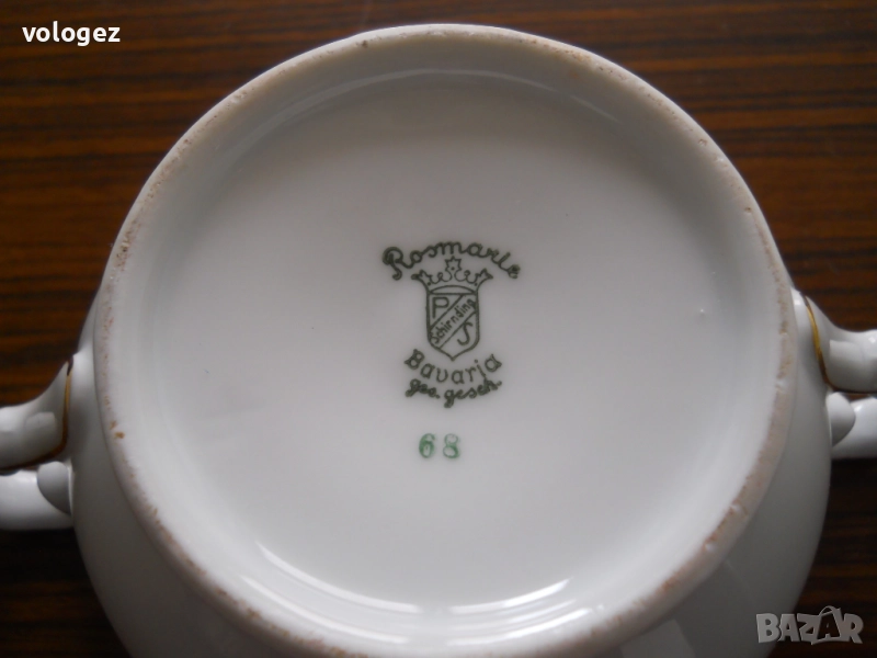 Маркировката на тази захарница е "Rosmaris Bavaria", което показва, че артикулът е произведен в региона Бавария, Германия. Надписът "ges. gesch." е съкращение от немски за "gesetzlich geschützt" (защитено от закона / регистрирана търговска марка), а номерът "68" е вътрешен производствен или инвентарен номер.