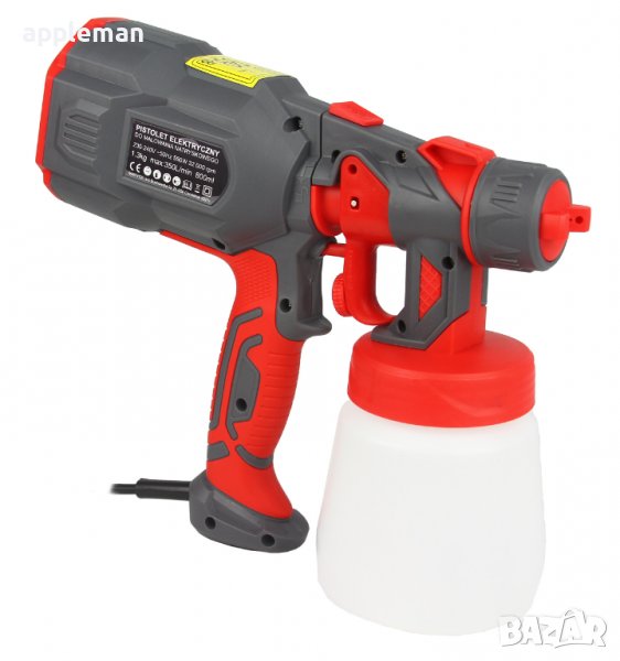 Електрически пистолет за боядисване MARPOL е с висока ефективност и дебитност. Той е изключително лесен и удобен за използване. Предназначен е за боядисване на всякакви повърхности с бои и лакове на водна основа. Пистолетът е снабден с компресор и не се нуждае от външно захранване със сгъстен въздух. Благодарение на компактният му дизайн и неплъзгащата се дръжка може да се боядиса и най-трудно достъпното място, което желаете да освежите. Пистолетът позволява равномерно разпръскване на боя / лак върху гладки и текстуриране повърхности. Той се предлага с 3 дюзи с различни размери и контейнер за боя на винт с вместимост 800 мл. Правилната струя се получава чрез завъртане на дюзата.