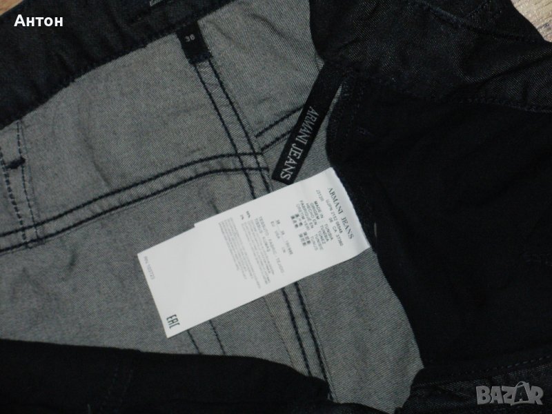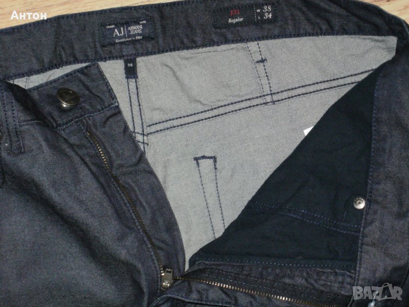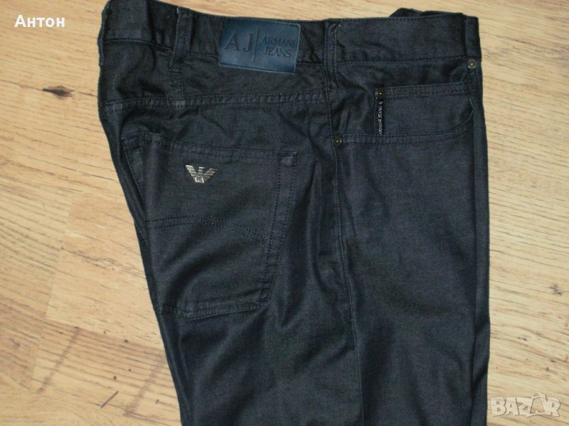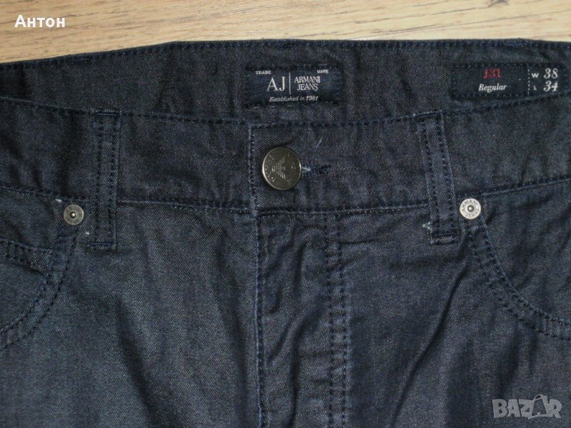 Дънките са на ARMANI JEANS, оригинлани, обличани, без забележки. По номер са 38 но мисля че отговарят на 36, сравнете мерките. Нямат еластичност в талията. Кройката е класическа. Цвета е като на снимките, материята е тънък тъмен деним от 98% памук и 2% еластан. Практична и качествена дреха.