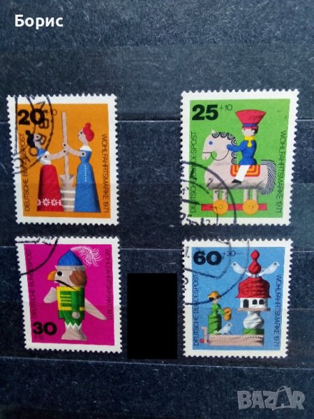 Комплектна серия благотворителни марки . Изобразени са стари дървени играчки . Номера по Михел 705 - 708 . Цена по Михел 2.60 ( сбор на стойностите поотделно 2.80 ) евро . Марки с високо качество за колекционери . Когато марките са с допълнителна такса / + / , пътувалите са по-ценни , защото допълнителната такса , която е за благотворителни цели е изпълнила предназначението си . Затова каталожната цена на пътувалите марки , почти винаги е по-висока от непътувалите .
