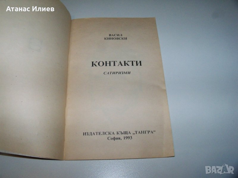 "Контакти" сатиризми, автор Васил Киновски, рядка библиофилска книга издадена през 1993г. от издателска къща "Тангра". Книгата е с меки корици, 28 стр. и е в отлично състояние. Издадена е в тираж от 500 бр. Гордост за всеки колекционер.