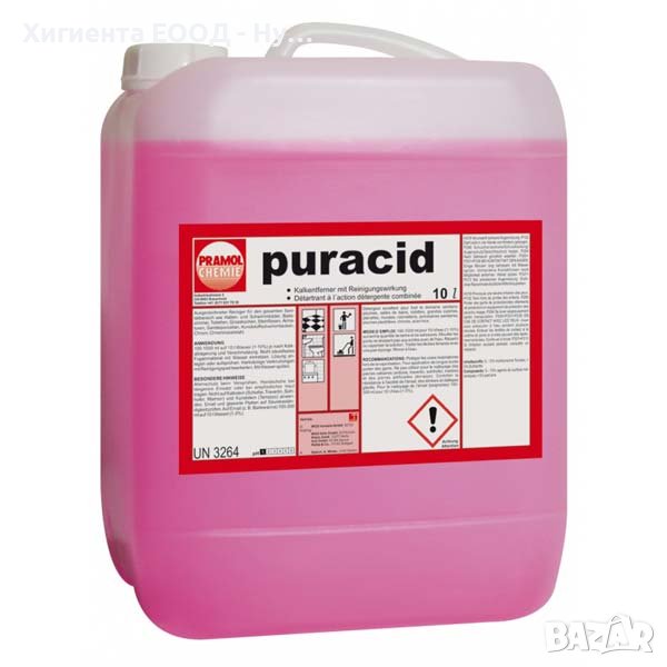Puracid е швейцарски професионален течен почистващ препарат за ефективно отстраняване на упорити варовикови отлагания и остатъци от сапун. Отличен почистващ ефект и върху мазнини и замърсявания. Не предизвиква корозивни изпарения. Детергентните суровини са биоразградими. Повърхностите и фитингите, почистени с Puracid , са хигиенично чисти.
