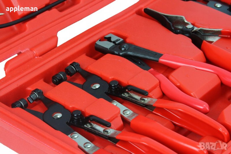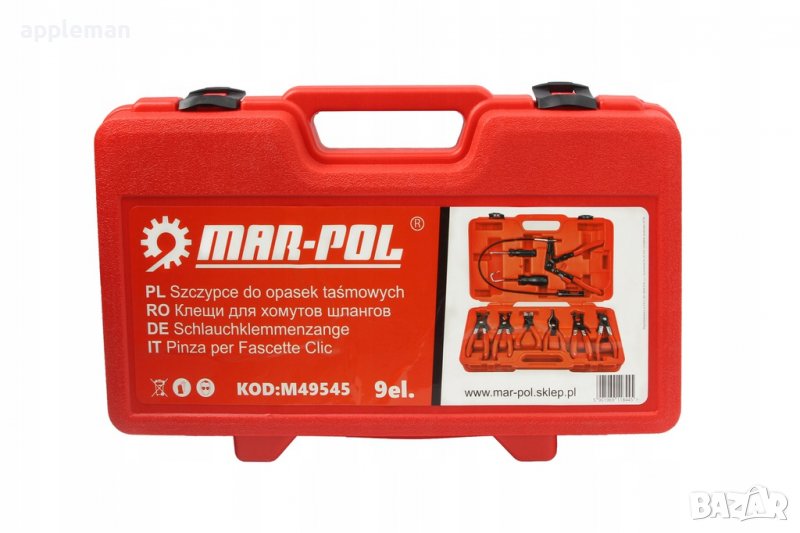 Комплект клещи за скоби на водни съединения 9 части MARPOL е полезен освен за водни съединения и за премахването на пластмасови и/или метални самозатягащи се скоби. Те се отличават с с ъглови челюсти и 360 градуса възможност за въртене за захващане на скоби под всякакъв ъгъл. Лесно премахват 5/32 до 1/2 вакуум на горивни маркучи. Резето на клещите в затегната позиция здраво държи скобата на съединението. Клещите могат да се заключват като ръцете ви остават свободни, което прави работата ви по-бърза и лесна.