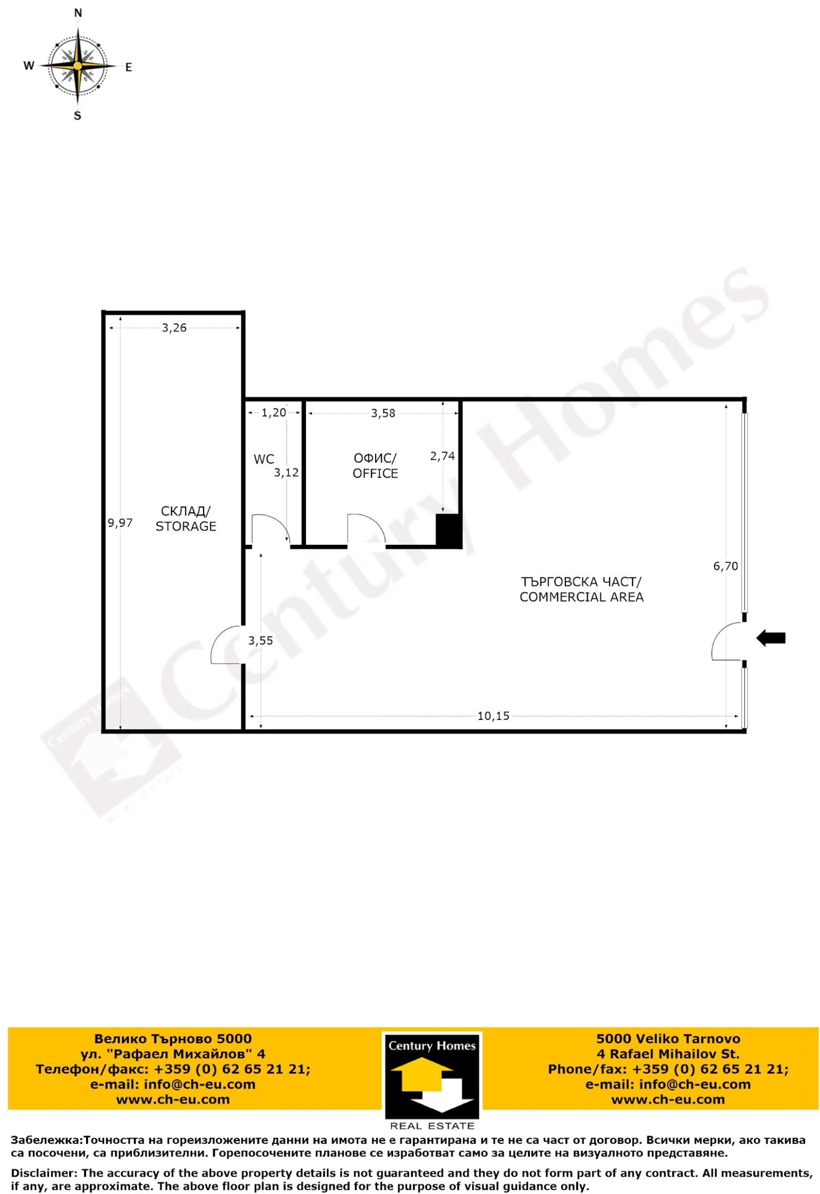 и включва просторна търговска част, складово помещение, офис помещение, малък кухненски кът и санитарен възел, изложението е изток. Имотът е газифициран, разполага с климатик, охранителна система.