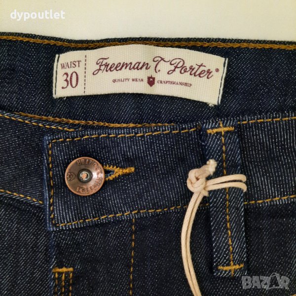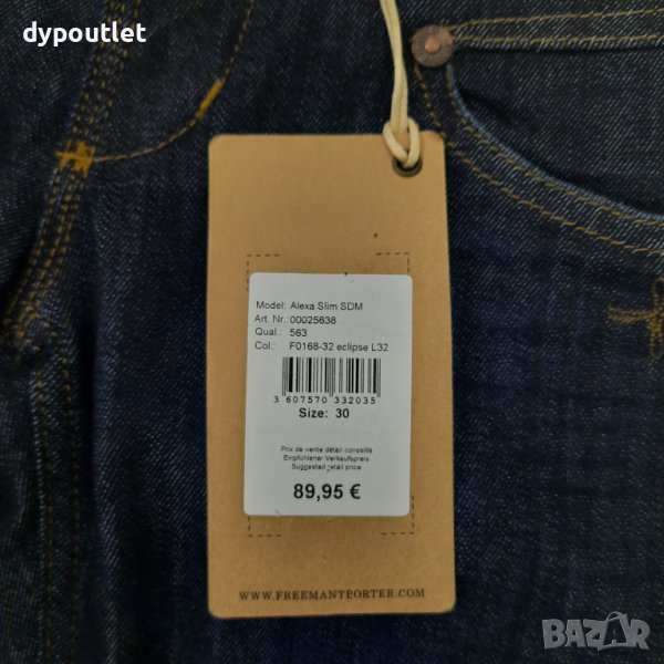 Alexa Slin SDM, Ниска талия, размер W30/L32. Дамски дънки Freeman T.Porter с ниска талия. Отпред има два джоба и един декоративен джоб с цип. Отзад също има два джоба и декоративен джоб с цип. Дънките се закопчават чрез цип. Състав: 75% памук, 25% еластан. Размери W30-L32 : дължина 100 см., ширина горна част 42 см., крачол долна част 17 см..